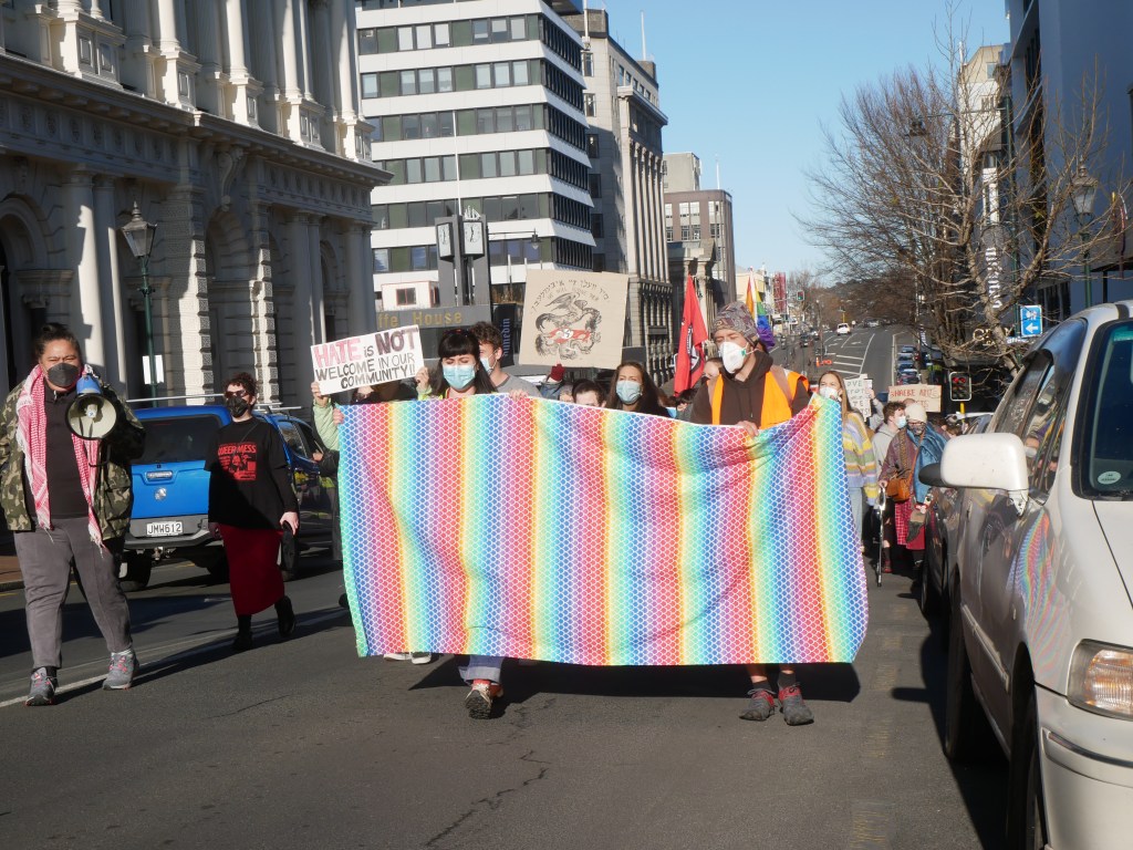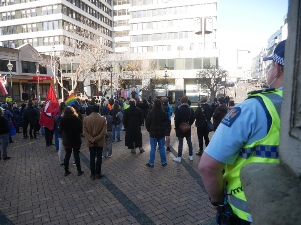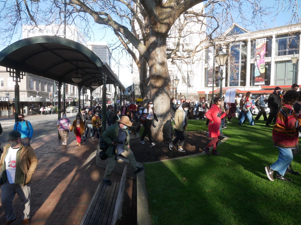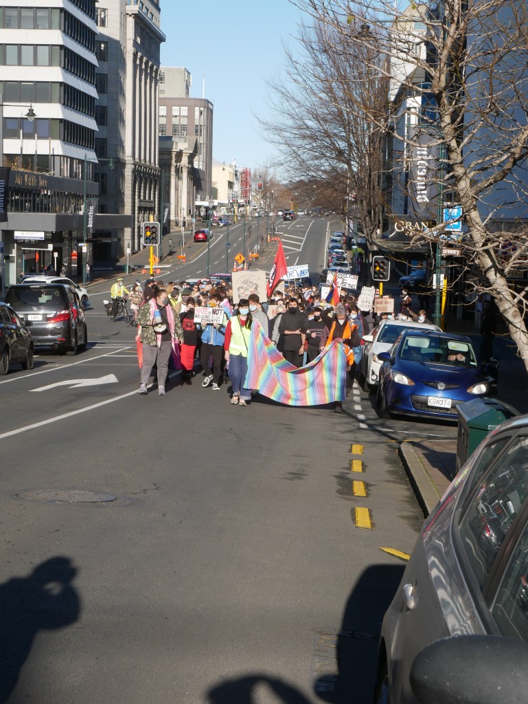 For a quick run through of the days goings on, about 20 people were milling around at the Exchange when I arrived around 10:30am. The mood was calm and upbeat, aided I’m sure by some stunning weather given our midwinter setting. By the time the organisers opened with a karakia at 11am sharp, the crowd numbered perhaps a shade over 100, overseen by a small group of cops parked in a No Parking zone (a taxi stand). Itinerary for the day, speeches from a representative of AntiFascist Ōtepoti Sina Brown-Davis and local composer/publican of Woof! bar Dudley Benson, and the crowd was off toward the Octagon well ahead of the FRC demonstration and numbering perhaps 150-200.