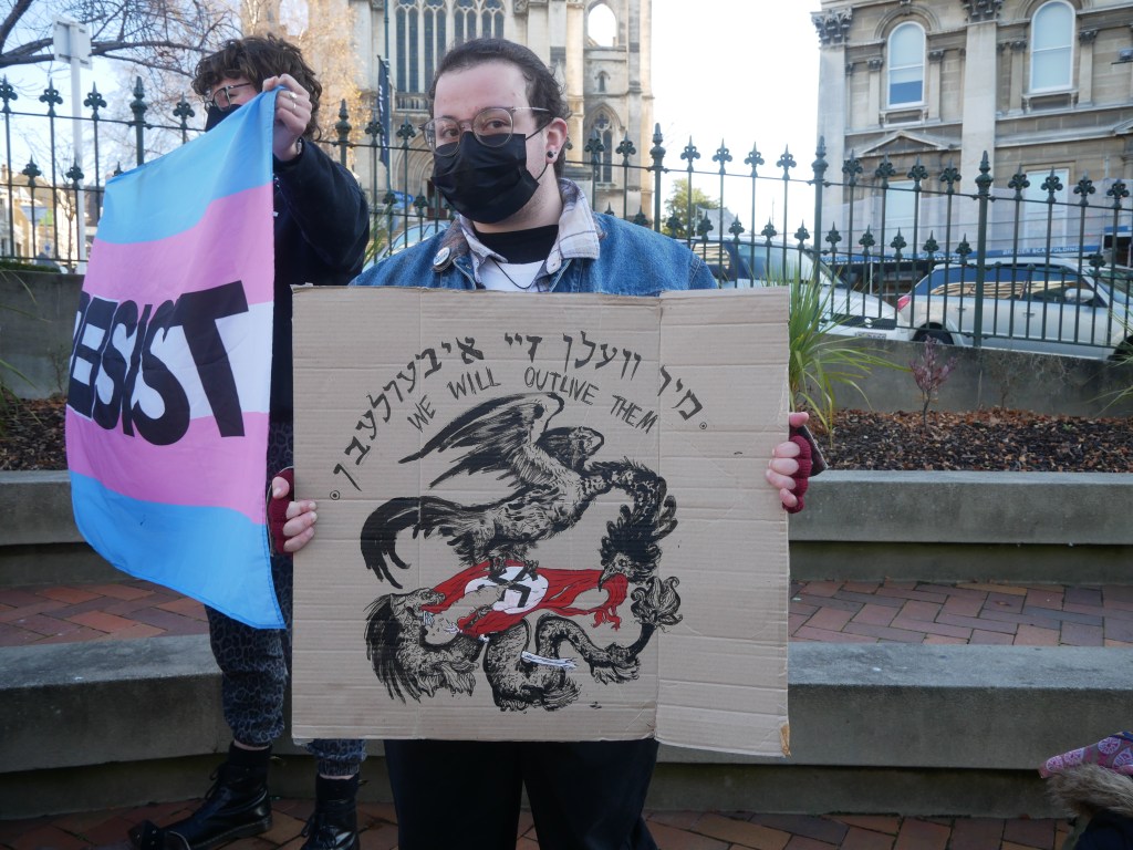 It’s a short walk and the march arrived perhaps 20 minutes in advance of Destiny & friends, so everyone was fairly energetic when they arrived to find a couple people anticipating the FRC march and seemingly a little annoyed by the rather prominent Pride themed regalia dotted throughout the crowd. At least, that’s what I caught from one woman yelling about genitalia between the laughter and chanting below her. After a minute or two, the crowd turned to ignore her and listen to a set from local musician Paul S. Allen, so far not much to write home about.