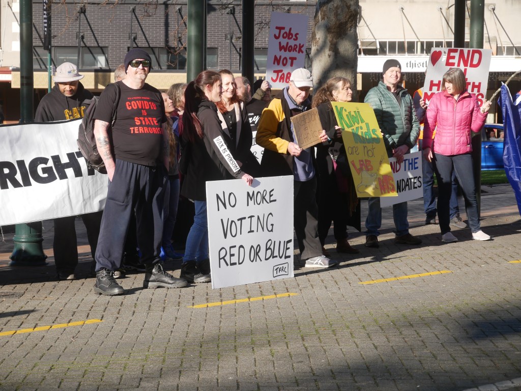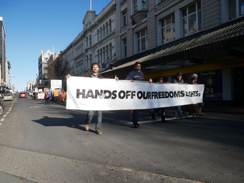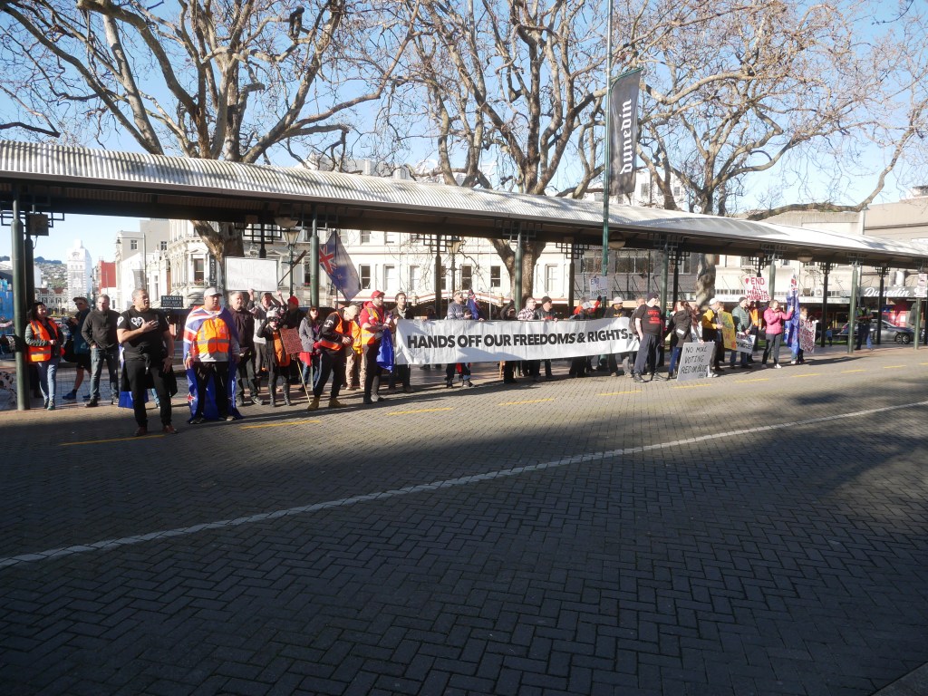 I do have a few notes on the day, but not much so I’ll get through them quick. For Destiny/the FRC it was a pretty average day out down south. They were clearly aiming for at least a respectable 100-200 to turn out, the 30 that did may not be much more than who came down to hold the march in the first place. My suspicion is that this was meant to be the splash needed to get a local FRC franchise off the ground and test the waters for agitation and recruitment in Otago/Southland, and if so the waters proved ice cold. Given the relatively decent turnout for previous rallies hosted by Voices for Freedom and for other anti-government causes from the right, the FRC/Destiny likely hoped the soil was fertile for their activities to expand southward. That factored in, Saturday’s rally will have been a disappointment by any measure.