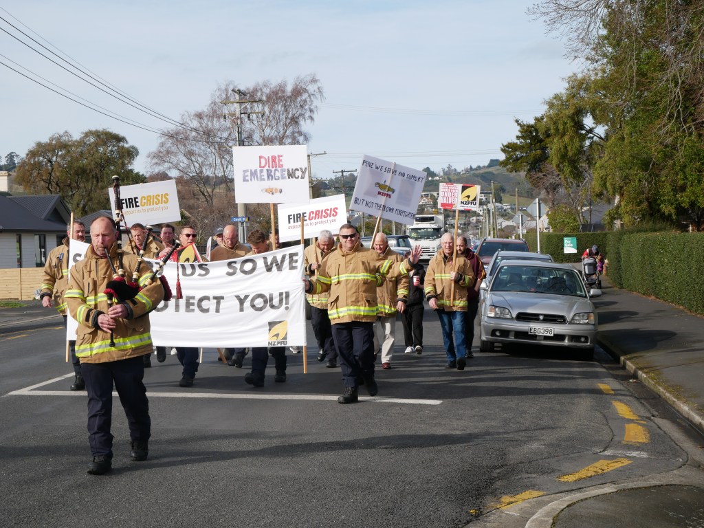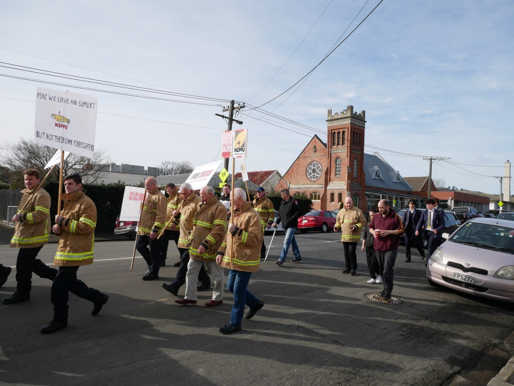 At any rate, I attended the Mosgiel picket and march with my mum (my grandfather being a 50 year veteran of the service, an affinity for firefighters runs in the family) and played once more the role of court photographer. Of the action itself there’s not much to say. A short march of about 20 fire staff and supporters to the corner of Factory and Gordon roads, roadside picket, and then a march back to the station for the shift to get back to work at midday on the dot. Not every demonstration is going to be exciting, sorry folks. Support was high, with a near constant stream of supportive shouts and toots from passers by and a generally friendly demeanor among the pedestrians who stopped for a chat.